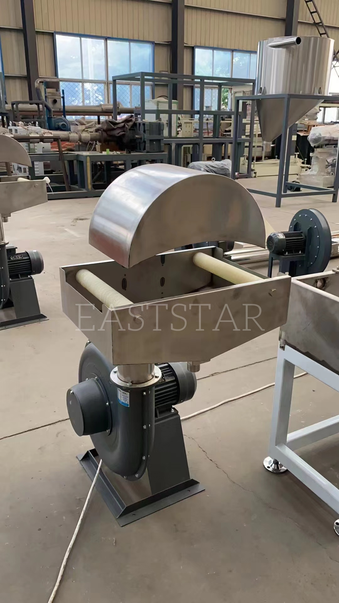 ที่เครื่องบดย่อยแบบสกรูคู่ขนานประกอบด้วยเครื่องป้อนมิเตอร์แบบเกลียวคู่ที่มีกำลัง 2.2kW และอัตราส่วนความเร็ว 17:1 ช่วยให้มั่นใจในการป้อนวัสดุที่สม่ำเสมอ สำหรับส่วนการตัด ระบบเม็ดพลาสติกใช้แม่แบบตัดร้อนที่มี 72 รูเส้นผ่านศูนย์กลาง 2.8 มม. เสริมด้วยใบมีดตัดสี่ใบในชุดประกอบเรเปียร์ เครื่องเป่าลมแรงดันสูงสองตัว (5.5kW และ 4kW) ลำเลียงเม็ดผ่านท่อสแตนเลสไปยังระบบแยกและรวบรวมอย่างมีประสิทธิภาพ
