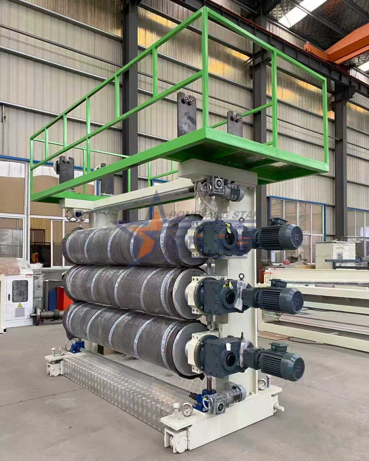 ที่สายการผลิตแผ่น ABS/HIPSของ Qingdao EASTSTAR เชี่ยวชาญการผลิต ABS (ไฮโดรคาร์บอนโคโพลีเมอร์) และ HIPS (เอทิลอะคริเลตความแข็งแรงสูง) ในปริมาณมากเส้นมีเครื่องอัดรีดแบบสกรูเดี่ยว J150-35/1 ซึ่งผลิตแผ่นที่มีเส้นผ่านศูนย์กลางประมาณ 2,000 เมตร และมีความหนาสม่ำเสมอ (1-6 มม.)ที่เครื่องอัดรีดผลิตจากเหล็กกล้าไนไตรด์คุณภาพสูง 38CrMoAlA ทั้งหมด และติดตั้งตัวแปลงความถี่ ABB ซึ่งช่วยให้ผลผลิตของวัตถุดิบทั้งสองนี้สูงถึง 400-600 กิโลกรัมต่อชั่วโมง