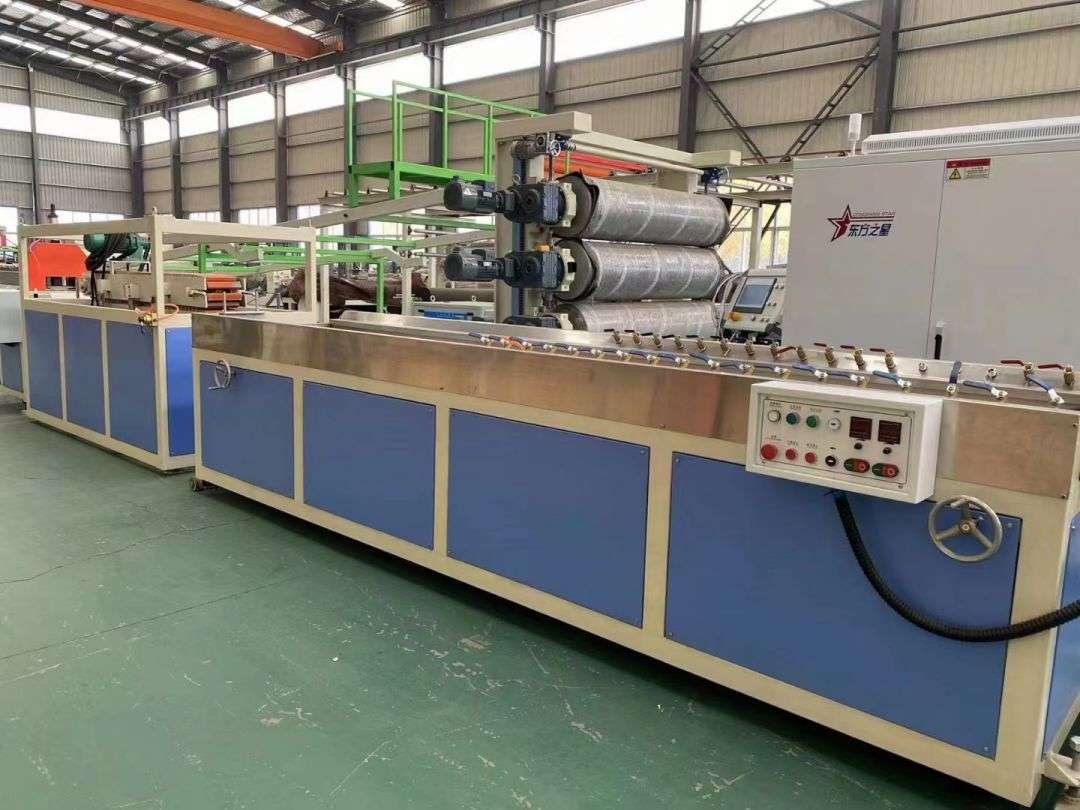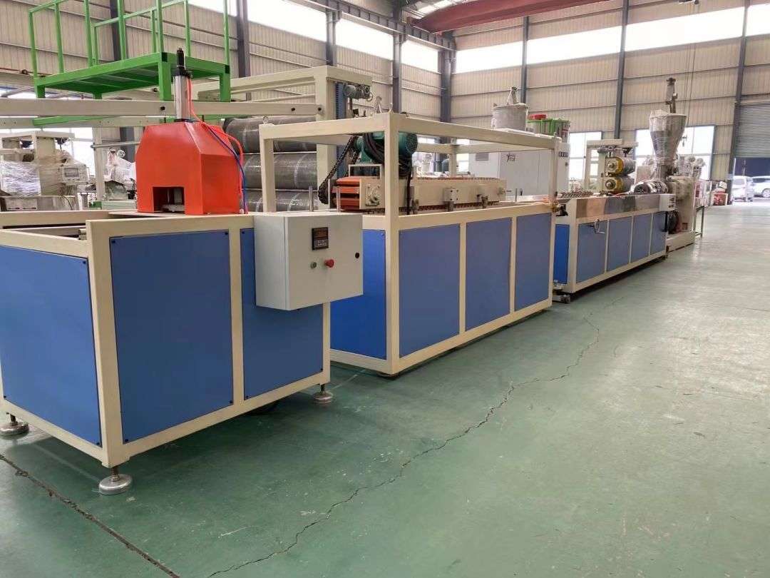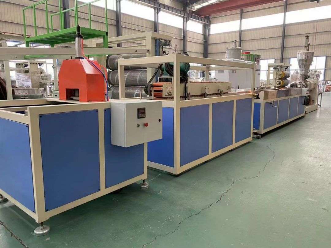 สายการผลิตโปรไฟล์ สายการผลิตโปรไฟล์ใช้เครื่องอัดรีดสกรูคู่ทรงกรวย SJSZ-65/132 ซีรีส์ แท่นสร้างรูปร่างสูญญากาศสแตนเลส รถแทรกเตอร์ตีนตะขาบ เครื่องตัดแบบรวมอัตโนมัติ และการพลิกชั้นวางขนถ่าย แท่นขึ้นรูปมีปั๊มสุญญากาศแรงดันสูงและปั๊มน้ำซึ่งปรับได้สี่มิติ รถแทรกเตอร์ถูกยึดด้วยระบบนิวแมติก เครื่องตัดความยาวคงที่อัตโนมัติใช้สวิตช์เคลื่อนที่เพื่อตัดตามความยาวคงที่ ชั้นวางแบบซ้อนได้ยาว 6 เมตร ทำจากสแตนเลสและพลิกกลับด้วยระบบนิวแมติก