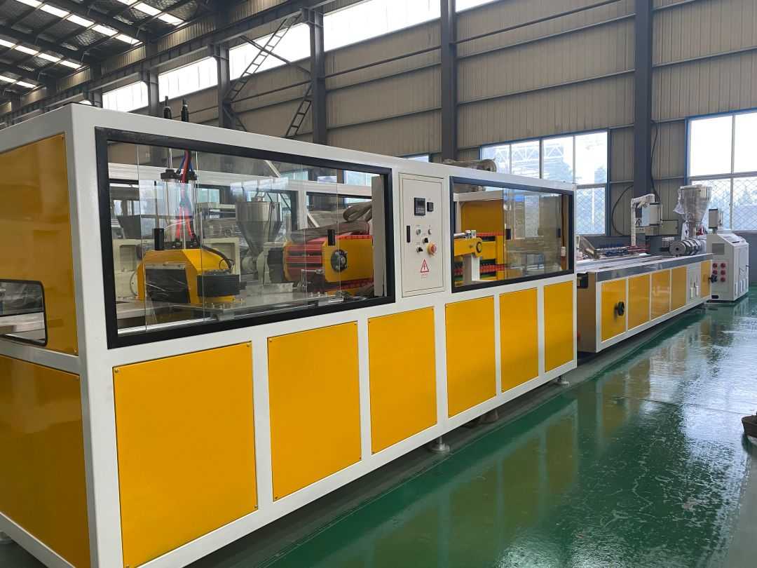 สายการผลิตการอัดขึ้นรูปพื้นไม้พลาสติก PVC - สายการผลิตการอัดขึ้นรูปพื้นพลาสติกไม้ใช้เครื่องอัดรีดสกรูคู่ทรงกรวย SJZ65/132 ซึ่งใช้เป็นพิเศษสำหรับการอัดขึ้นรูป การทำพลาสติก และการขึ้นรูปผง PE + วัตถุดิบผงไม้ มีลักษณะของผลผลิตสูง ผลการขึ้นรูปพลาสติกที่ดีและการใช้พลังงานต่ำ