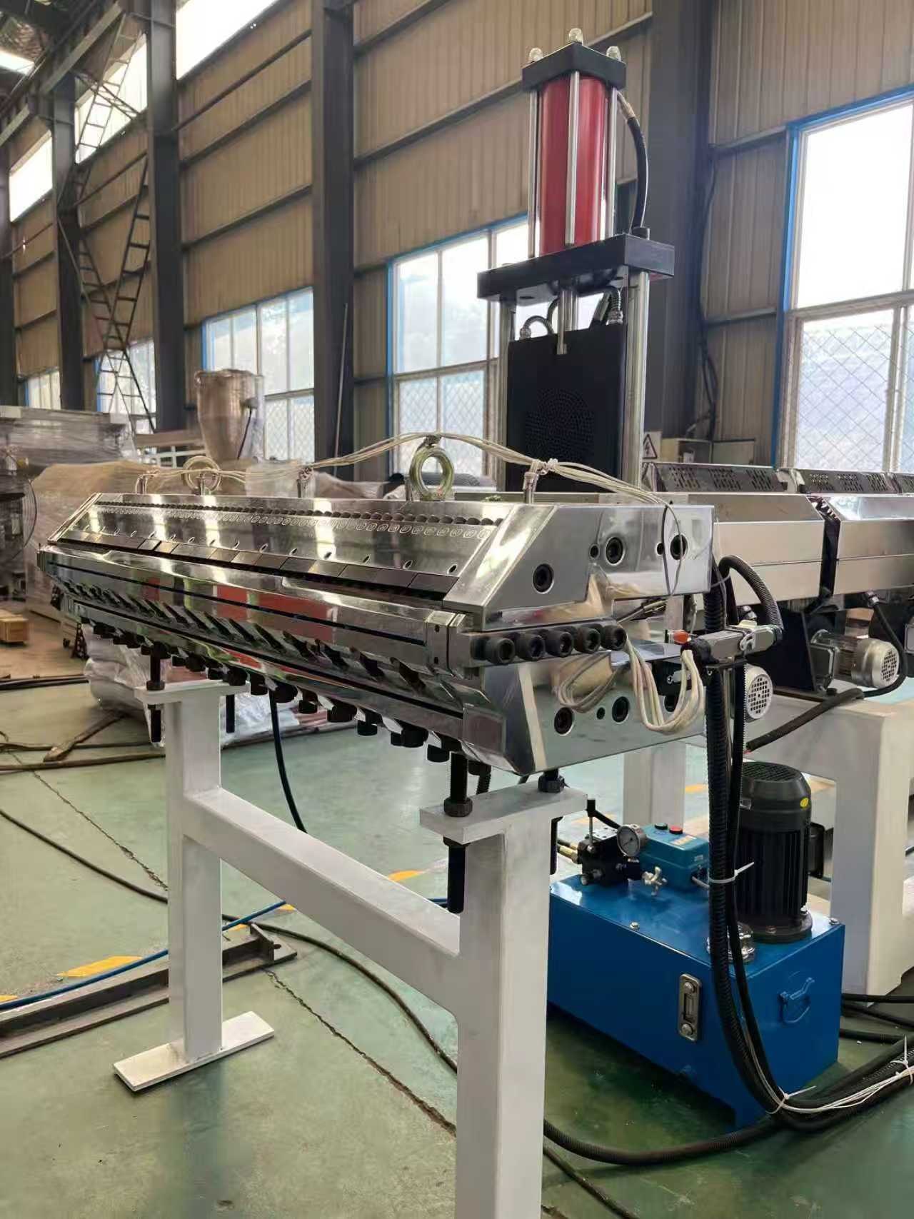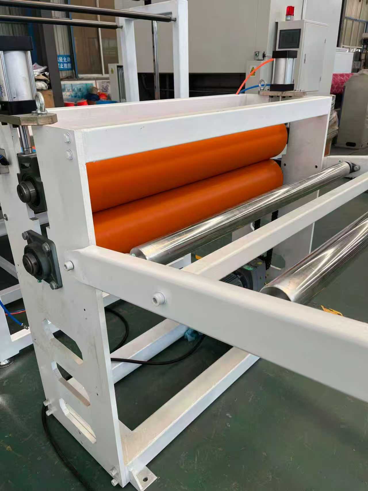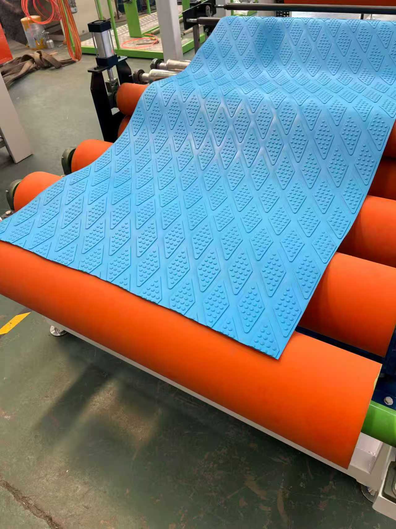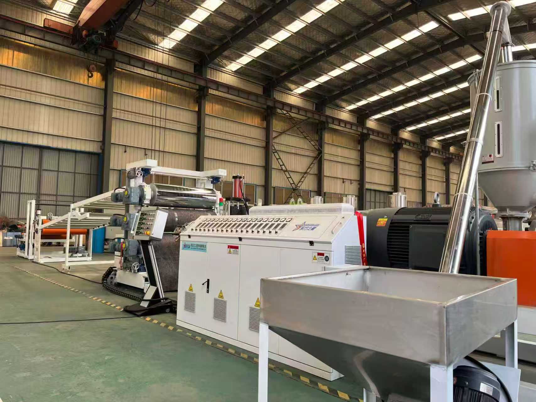 อุปกรณ์พรมกันลื่น TPE-1000 มม. พรมปูพื้นรถยนต์: อุปกรณ์ส่วนใหญ่ประกอบด้วยเครื่องอัดรีดแบบสกรูเดี่ยว, เครื่องอัดรีดแบบสามลูกกลิ้ง, ขาระบายความร้อนยาว 6 เมตร, เครื่องดึงลูกกลิ้งยาง, เครื่องตัดและอุปกรณ์สายพานลำเลียง